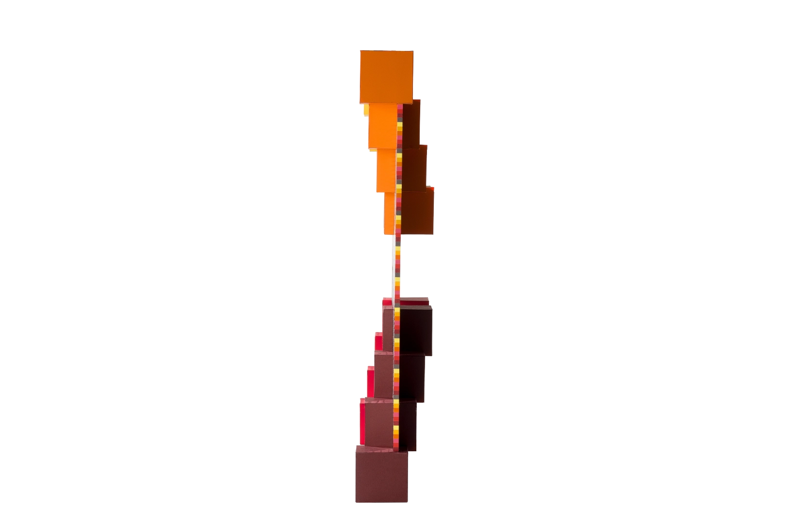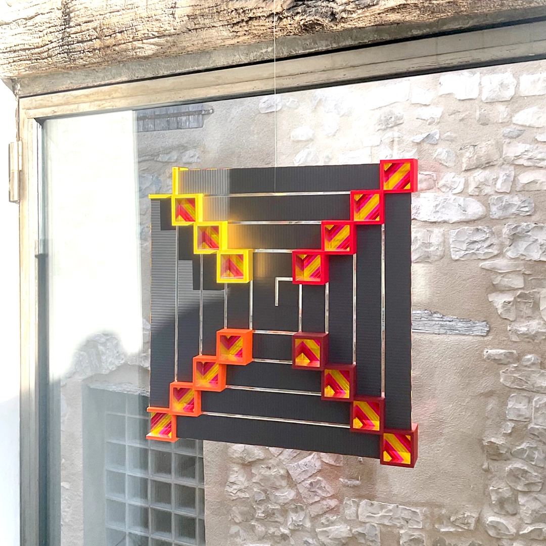 Découpe à la main, collage papiers sur carton plume, films de couleurs sur acétate ; travaillé en volume recto verso, œuvre à suspendre ( fil de nylon) ou posé sur un côté.