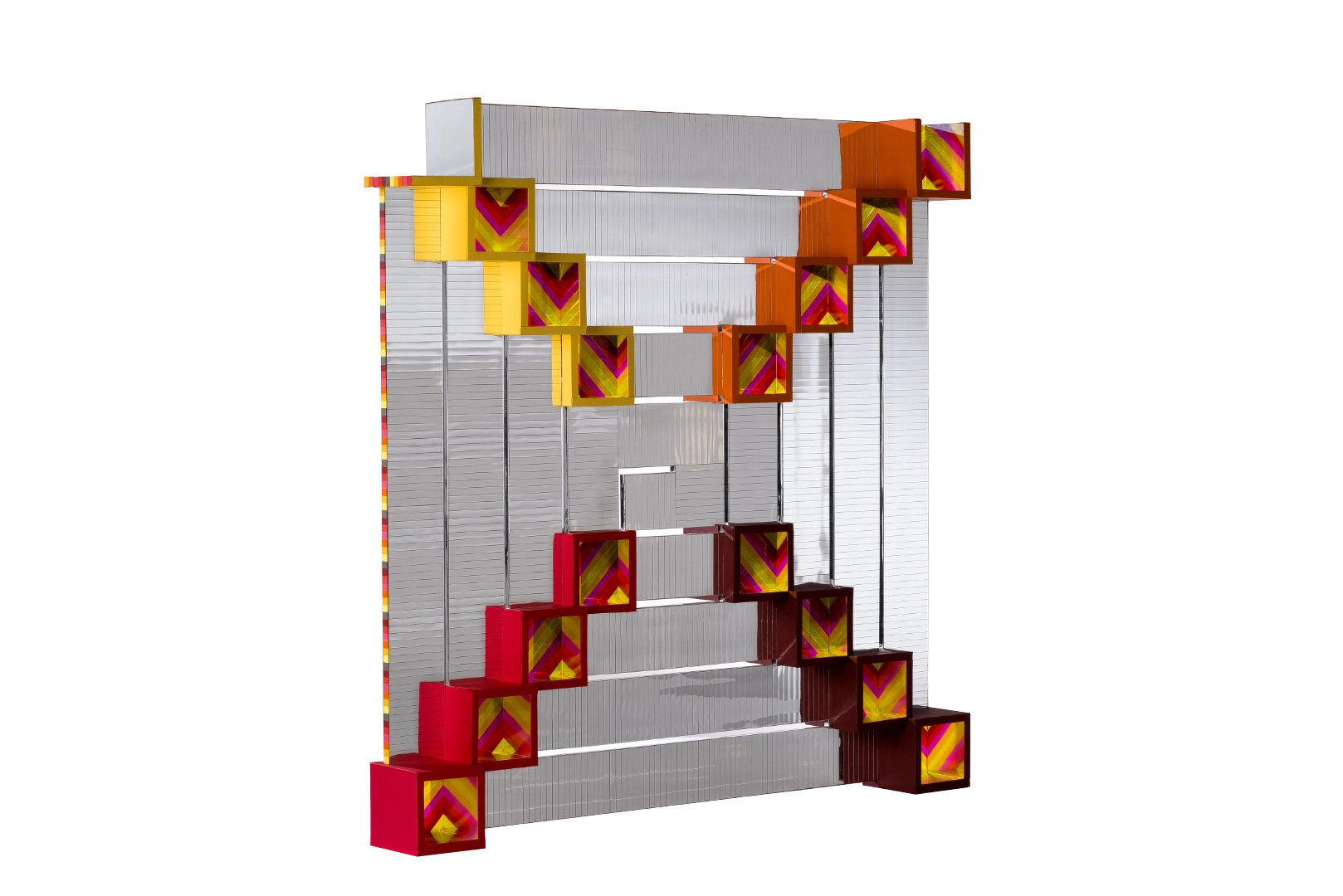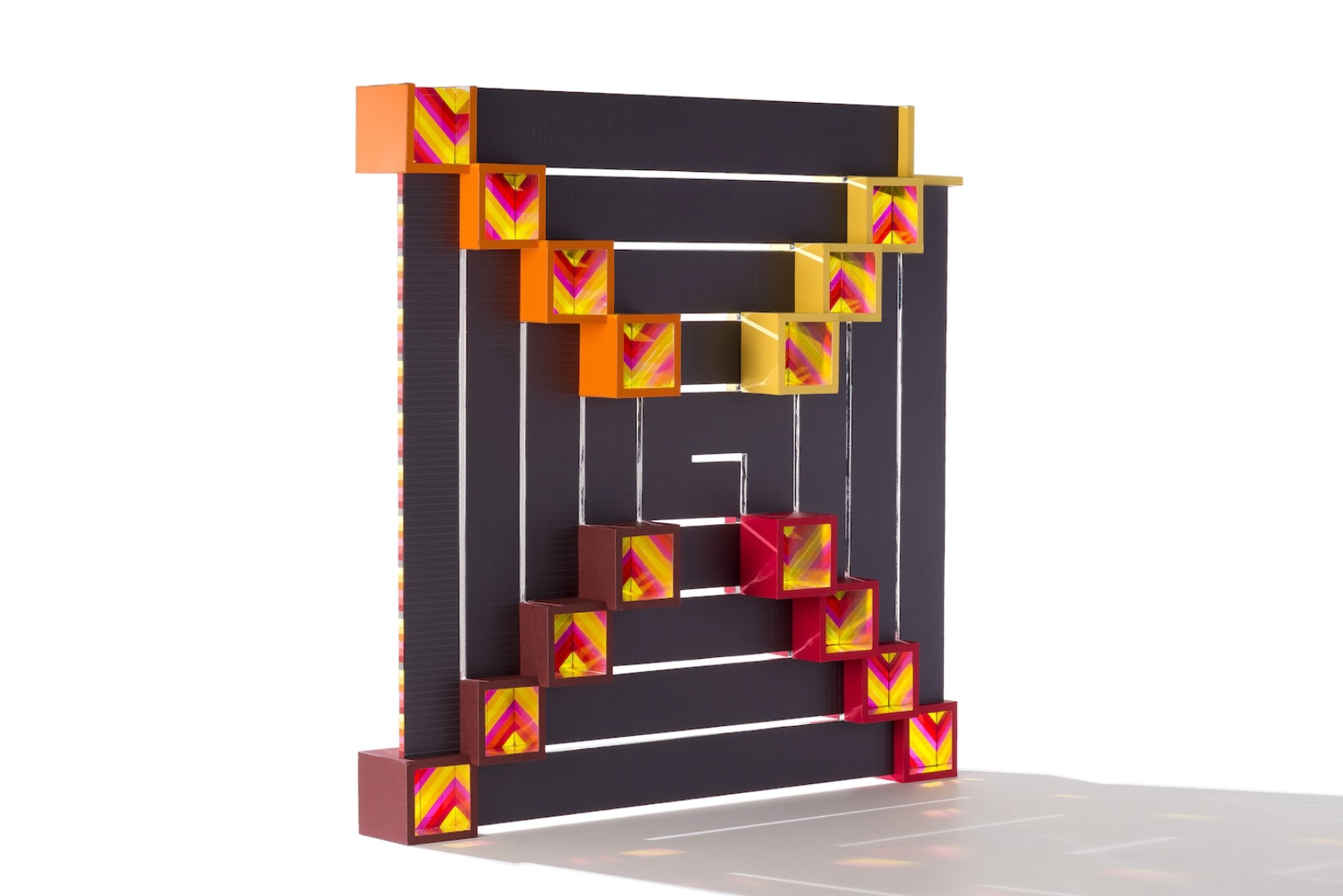 Technique : collage papiers sur carton plume, découpe à la main, films de couleurs sur acétate