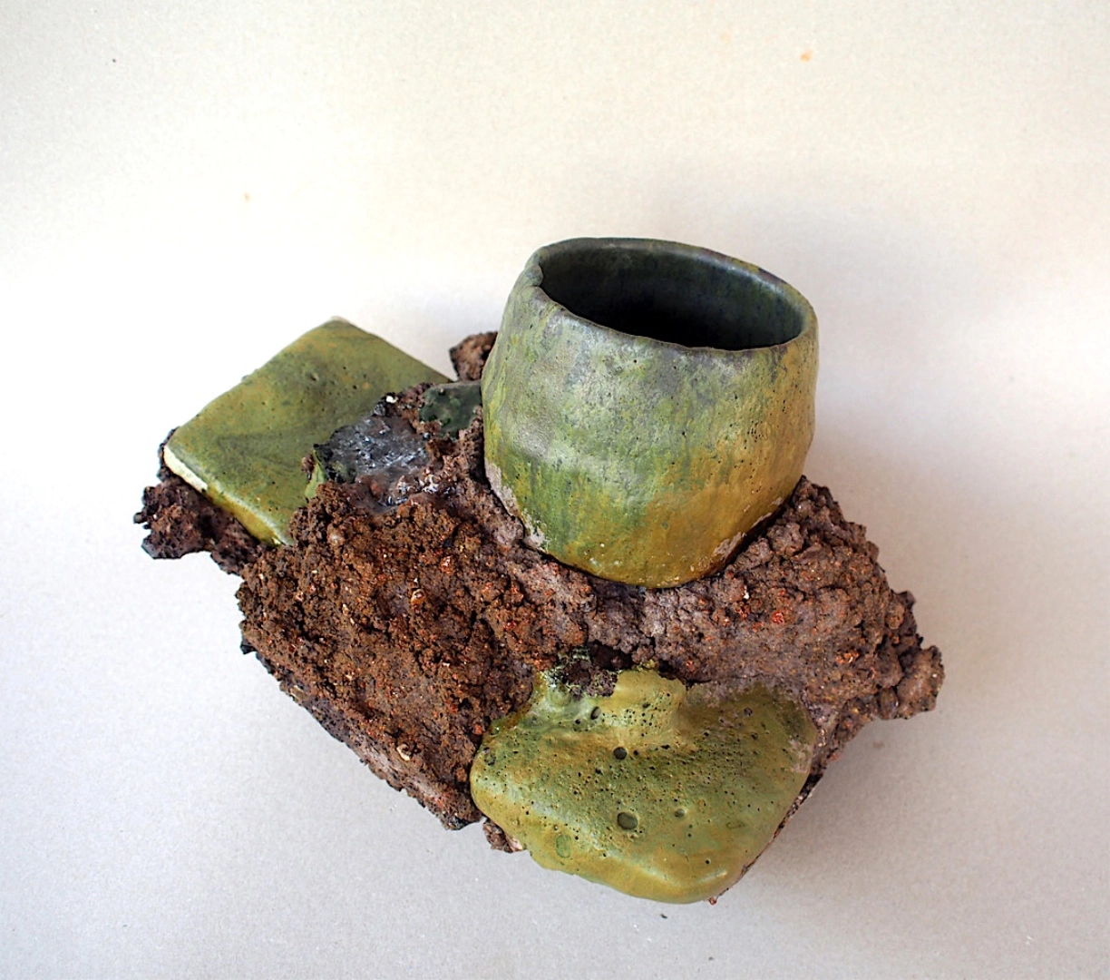 The interior void interacts with an organic wall. The material seems frozen in mid-motion. It resembles an eruption or a primal chaos. Raku is sometimes combined with concrete or glass.